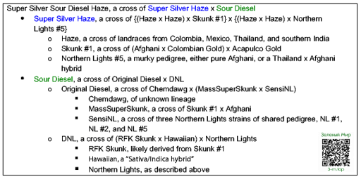 Штамм АК-47 является ярким примером произвольности народной классификации. На Кубке каннабиса 1999 года он выиграл в номинации «лучшая сатива», но уже 4 года спустя был признан как «лучшая индика». Отличным окном в этот лабиринт сомнительных родословных является родословная и «Super Silver Sour Diesel Haze»: