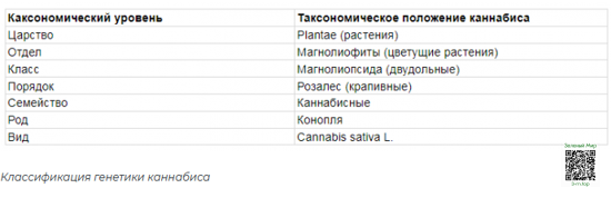 Карл Линней определил таксономический род и виды каннабиса еще в 1753 году, идентифицировав растение как «Cannabis sativa L.». («Cannabis» относится к роду, в то время как "sativa L." относится к виду). Согласно системе этой классификации, которая пытается идентифицировать и систематизировать эволюционную историю всех живых существ на земле, генетика каннабиса организована следующим образом: